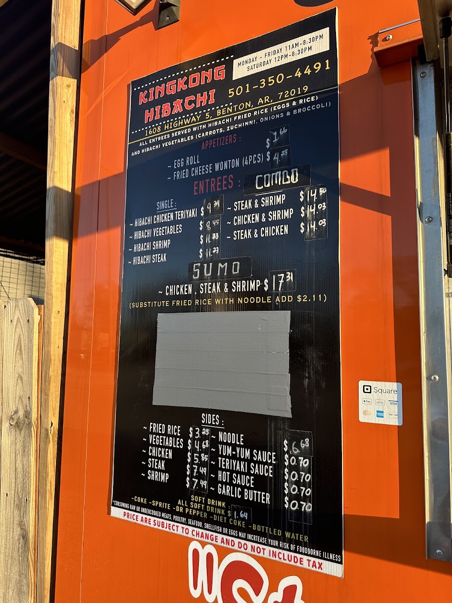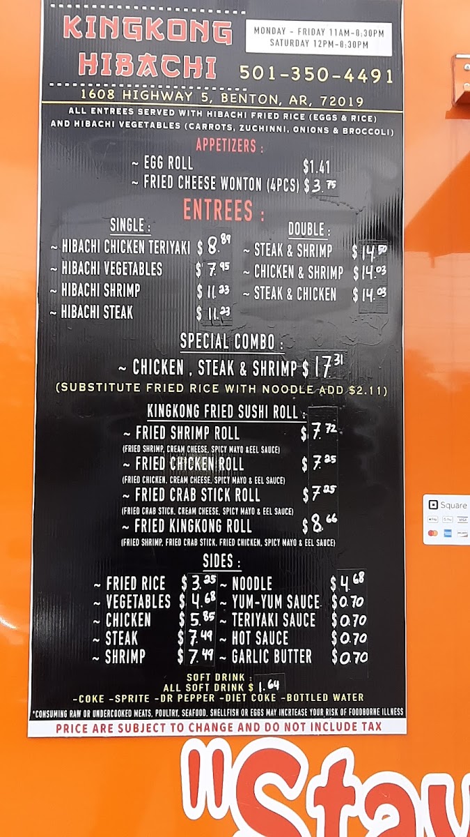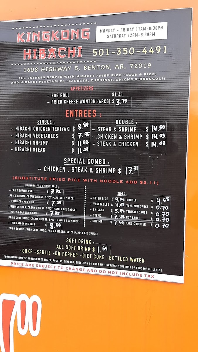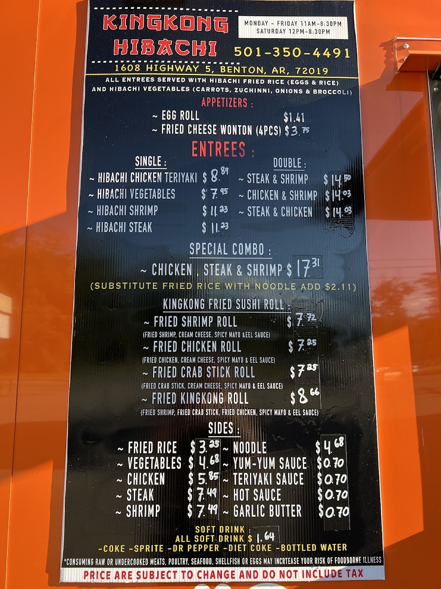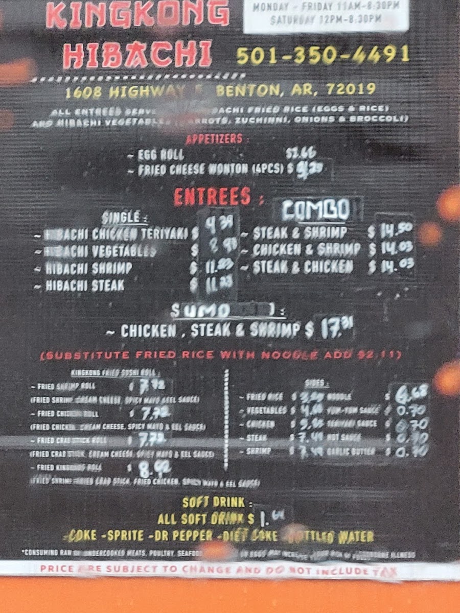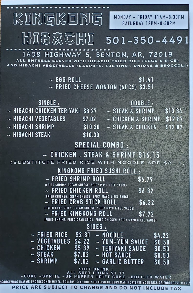 The menu at Kingkong Hibachi in Benton, AR offers a variety of flavorful options to satisfy any craving. The Fried Crab Sushi Roll, KINGKONG ROLL SUSHI, Fried Shrimp Sushi Roll, and Fried Chicken Sushi Roll are standout choices for sushi lovers, featuring a delicious blend of crispy textures and fresh ingredients. For those seeking hibachi classics, the menu includes options like Hibachi Shrimp, Hibachi Vegetables, Hibachi Steak, and Hibachi Chicken Teriyaki, offering a perfect balance of savory flavors. Side dishes such as Yum-Yum Sauce, Teriyaki Sauce, Garlic Butter, Noodles, and Fried Rice complement the main courses beautifully. The Egg Roll and Fried Cheese Wonton (4 Pieces) are great appetizers to kick off the meal. For a heartier option, the Double section features choices like Chicken & Shrimp, Steak & Shrimp, and Steak & Chicken, providing a satisfying combination of meats. If you're craving a complete meal, the Special Combo of Chicken, Steak & Shrimp is an excellent choice. To round out your meal, enjoy a refreshing Soft Drink such as Sprite, Coke, Dr Pepper, Diet Coke, or Bottled Water. Whether you're in the mood for sushi, hibachi, or a combination, Kingkong Hibachi offers an exciting array of dishes sure to please.